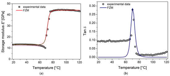 Comparison of the experimental data of DMA with predictions from the FZM: (a) storage modulus E′; (b) tan δ.