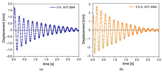 Figure 9a shows the free vibration response of the mass-spring NiTi system at 0 A. An underdamped oscillatory response of the vibration is observed, that is, the vibration decays exponentially over time. In vibratory systems, the damping capacity can come from different sources, for example, the interaction with the surrounding medium or from the internal friction. In this condition, the NiTi SMA spring is in the martensite phase, a crystalline structure with damping resulting from the stress-induced movement of the martensite–martensite interfaces (twin movement) [1,5,15]. Posteriorly, the spring is heated by applying an electrical current of 2.5 A. The current generates the Joule effect, which increases the temperature of the coil spring, allowing it to contract and pass to the austenite phase. After this, the mass-spring NiTi system begins to vibrate freely. Figure 9b shows the free vibration result, where an underdamped response is observed, similar to that in Figure 9a. From the classical point of view, these vibratory responses can be interpreted under the framework of second-order differential equations; however, the nonlinearities associated with the material under study generate certain discrepancies [35,36]. Future work will be carried out to model the vibration response using the fractional calculus approach.