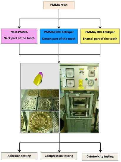 - Raszewski, Z.; Nowakowska-Toporowska, A.; Wezgowiec, J.; Nowakowska, D.; Wieckiewicz, W. Influence of silanized silica and silanized feldspar addition on the mechanical behavior of polymethyl methacrylate resin denture teeth. J. Prosthet. Dent. 2020, 123, 647.e1–647.e7. [Google Scholar] [CrossRef] [PubMed]