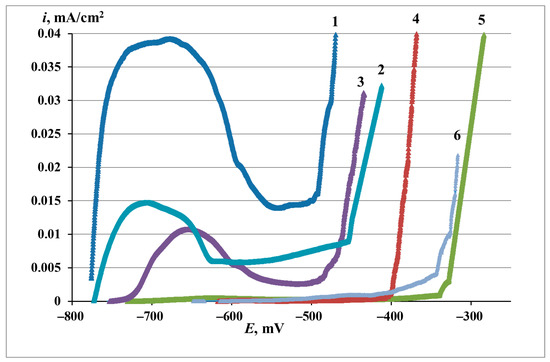 Anodic polarization curves of zinc (BBS, pH 7.36, 1 mM NaCl) in the initial state (1), after TT without a CIN, τexp = 24 h (2), and after CT in EHA vapors with various τexp: (3)—1 h; (4)—5 h; (5)—24 h; (6)—72 h. tCT = 100 °C; τCT = 1 h.