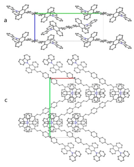 As can be seen from the single crystal in Figure 2 and Figure 3, the anthracene is nearly perpendicular to the intramolecular carbazole and styrene building blocks, the two molecules of anthracene are nearly parallel, and the intermediate 4,4′-divinylbiphenyl is perfectly coplanar. In the a-axis direction, intermolecular staggered vertical stacking occurs, and the anthracene of the middle molecule is perpendicular to the carbazole and phenyl rings of the neighboring molecules, respectively. In the c-axis, layered parallel stacking occurs between molecules, and in the b-axis, zigzag stacking occurs between molecules, which is the smallest mode of stacking with conjugation between molecules (σH-π). This unique structure minimizes the fluorescence quenching caused by solid-state stacking.