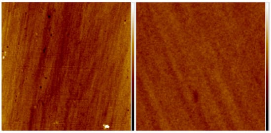 Then, pure films (120 nm) and CBP-doped vacuum-deposited films (120 nm, BABCz/CBP = 1/5) of BABCz were prepared for examining the film-forming properties of materials and the photophysical properties of solid-state films. From the atomic force microscopy (AFM) images of the two films (5 × 5 μm) (Figure 5), it can be seen that the root mean square roughness (RMS) of the doped films is much smaller, only 0.49 nm. The RMS of pure membranes is relatively high, reaching 1 nm. It can be seen that the film-forming performance of this material is not good enough. It is more appropriate to select BABCz and CBP doped film for device preparation.