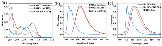 (a) UV-visible absorption spectra; (b) fluorescence emission spectra in solutions; and (c) fluorescence emission spectra in films.