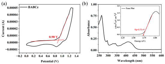 (a) Cyclic voltammetry curve of BABCz; (b) calculating energy gap by the Tauc plot.