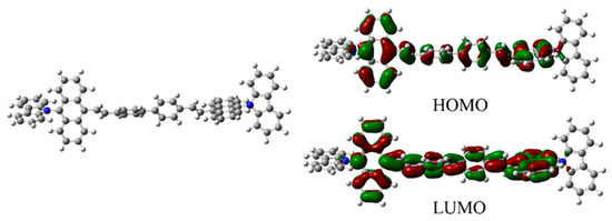 The experimentally measured values by the CV method were −5.65 eV and −2.93 eV, respectively. A band gap of 2.72 eV. The HOMO and LUMO energy levels obtained by theoretical calculations are also summarized in Table 2.