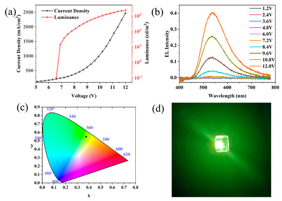 (a) J-V-L characteristic curve; (b) spectral curve under different voltages; (c) chromaticity coordinate; (d) OLED device based on BABCz.