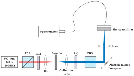 The second harmonic measurements were carried out using a mode-locked Ti:sapphire laser (model: Mira, Coherent Inc., Santa Clara, CA, USA) coupled into a Nikon (model: Eclipse Ti2, Nikon Europe B.V., Amstelveen, The Netherlands) inverted microscope, as shown in Figure 2. A calcite Glan–Taylor polarization followed by a zero-order half-wave plate controlled the incident polarization. A Nikon CFI Plan Fluor ×10 objective focused the beam onto the samples, while a Mad City Labs (Madison, WI, USA) xyz piezo-controlled translation stage positioned the samples in the focal plane with sub-micrometer accuracy. Incident powers ranged from 5 mW for the sample to approximately one hundred microWatts for the BBO crystal used for calibration of the system’s sensitivity. Although the Fourier limit of the pulse duration is approximately 85 fs, we estimate that the duration stretched to approximately 120 fs when incident on the sample because of the combined effect of the calcite polarizer and the microscope objective. The detection arm along the transillumination direction consisted of a 40 mm focal length best form lens (model:LBF254-040-A, Thorlabs, Newton, NJ, USA) to collimate the second harmonic light followed by a zero-order half-wave plate polarizer combination to analyze the emitted second harmonic light. A long-pass dichroic mirror (Thorlabs DMLP650) filters out most of the incident light while reflecting 98% of the second harmonic light. A short focal length lens then focuses the beam through a narrow band-pass filter (Thorlabs FBH400-40 nm) onto a fiber bundle coupled to an Andor imaging spectrometer (model: Shamrock 300i, Andor Technology Belfast, UKequipped with a cooled CCD array (model: Andor Technology Belfast, Newton, UK).