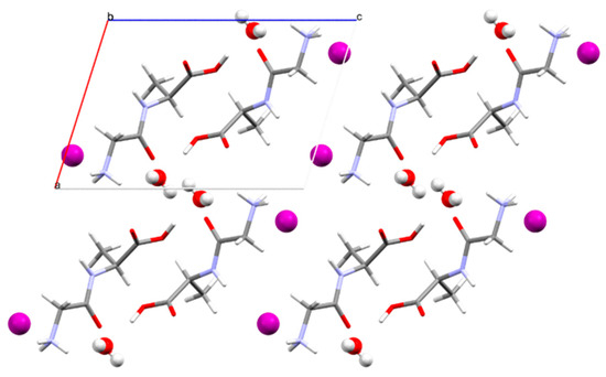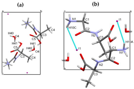 As referred to above, Gly-L-Ala.HI.H2O (Poly2) is a polymorph of Gly-L-Ala.HI.H2O (Poly1) that was reported by Kehrer et al. in 1989 [1]. However, no crystal data could be found in the Cambridge Crystallographic Data Centre (CCDC) [33] for graphical comparison. Both structures have comparable unit cells (a = 7.747(6) Å, b = 6.435(5) Å, c = 10.941(9) Å, α = 90°, β = 107.53(3)°, γ = 90° for Gly-L-Ala.HI.H2O (Poly2) vs. a = 10.933(3) Å, b = 6.371(2) Å, c = 7.709(1) Å, α = 90°, β = 107.29(1)°, γ = 90° for Gly-L-Ala.HI.H2O (Poly1) but with axis a and c interchanged. The unit cell atomic coordinates are different in both crystals, the more evident being the location of the iodide anion, which in Gly-L-Ala.HI.H2O (Poly1) has y fixed at and in Gly-L-Ala.HI.H2O (Poly2) is at .
