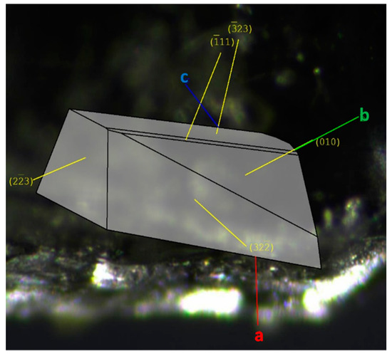Morphology and face indexing of Gly-L-Ala.HI.H2O (Poly2) with axes a (red), b (green) and c (blue) and overlaid assigned Miller indices.