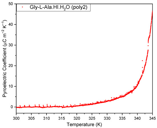 The pyroelectric coefficient versus temperature, measured during heating of the glycyl-L-alanine hydroiodide polymorph (Gly-L-Ala.HI.H2O (Poly2)) crystal from room temperature to 345 K. A maximum modulus of 45 µC/m2K occurs at 345 K.
