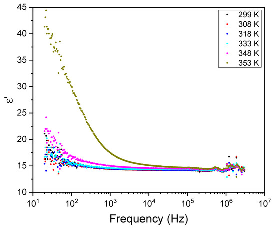 Figure 11 and Figure 12 show the frequency dependence of the real and imaginary electric permittivity at different temperatures. Both ε′ and ε″ present an initial sharp drop in the low-frequency region and afterwards attain a slower decrease at high frequencies. The initial, low-frequency drop in the imaginary part reveals a contribution from a conductivity term, as the samples are non-ideal capacitors.