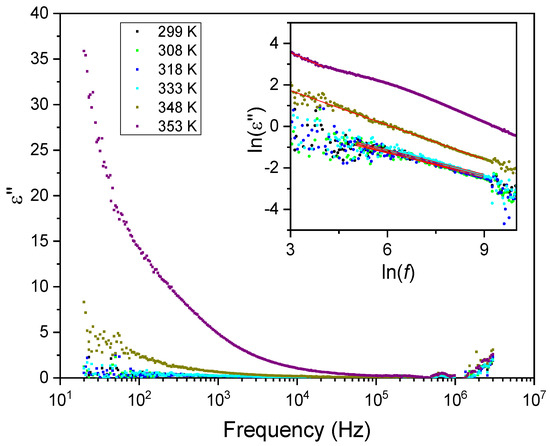 The imaginary part of the electric permittivity, ε″, as a function of frequency for different temperatures. The inset shows an ln–ln plot, where the linear dependence is observed due to the contribution from the DC conductivity (red lines).
