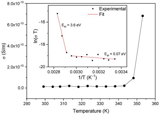 where T is the temperature, kB is the Boltzmann constant and σ0 is a constant. The activation energy can be determined from the slopes of the fittings to the curves of as a function of the inverse of T for the different temperature regions, as shown in the inset of Figure 13. The two temperature regions with different conductivities and the corresponding activation energy () values are shown in the figure. corresponds to the low-temperature region and is characteristic of electrical conduction through the polaron transport behavior [42]. At higher temperatures, the activation energy increases to , which is characteristic of ionic conduction in the samples [40]. As such, the two observed regimes are due to the change from the low-temperature, polaronic transport behavior to the high-temperature ionic conductivity dependence. This region is associated with the onset of temperature-induced changes in the samples (e.g., loss of water as observed from the TGA results, which starts just above 350 K).