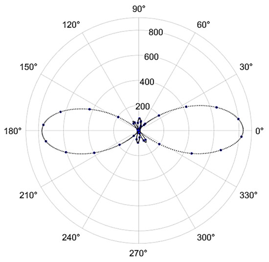 The second harmonic signal generated by the Gly-L-Ala.HI.H2O (Poly2) crystal as a function of the orientation of the fundamental beam’s polarization orientation relative to the transmission axis of the analyzer. Experimental points are in blue, whereas the dotted black line is a spline fit to the data.