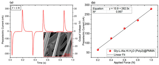 The applied stress (force per unit area) ranged between and . For Gly-L-Ala.HI.H2O (Poly2)@PMMA fiber mats, a applied periodical force gave rise to a maximum instantaneous output piezoelectric voltage and current of and respectively, as shown in Figure 16a. Here, the two opposite peaks correspond to the press and release of the fiber mat. A plot of the output voltage as a function of several applied periodic forces shows an output voltage increasing linearly with the force magnitude as expected (Figure 16b). The PMMA polymer matrix is not piezoelectric and does not contribute to the measured piezoelectric voltage. Taking into account a response time of , the magnitude of is obtained from the integration of the induced piezoelectric current over that period of time, , resulting in for Gly-L-Ala.HI.H2O (Poly2)@PMMA fiber mats. This induced charge, which is related to the applied force by the equation , allows us to calculate an effective piezoelectric coefficient equal to . This value is of the same order of magnitude as that obtained for organic–inorganic ferroelectric perovskite trimethylchloromethyl ammonium trichloromanganese ((TMCM)MnCl3), where , and barium titanate (BaTiO3), with [44,45]. It is also important to compare the present result, , with that obtained for lead-free organic–inorganic perovskite (N-methyl-N′-diazabicyclo [2.2.2]octonium)–ammonium triiodide (MDABCO-NH4I3) embedded into PMMA electrospun fibers (MDABCO-NH4I3@PMMA in a 1:5 ratio), which was reported to be [46], (Table 3).