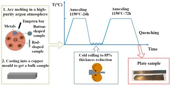 CoCrFeNi and CoCrFeMnNi alloys and the reference Ni sample were obtained from the Beijing Institute of Technology (Beijing, China) by the following technology. Bulk ingots were prepared from powders of pure (up to 99.97%) metals by arc-melting in a high-purity argon atmosphere, followed by casting into copper cuvettes. After their crystallization, annealing was carried out for 24 h at 1150 °C, in order to spheroidize and homogenize the grain structure of the samples (Figure 1). Subsequently, cold-rolling was carried out until the thickness of the ingots decreased by 85%, and the final annealing at 1150 °С for 72 h was carried out in order to reduce the texture and stresses caused by rolling.