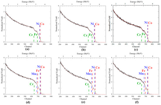 HIRBS spectra of: (a,d) unirradiated and irradiated by He2+ ions (40 keV) with fluences of (b,e) 5 × 1016 cm−2 and (c,f) 2 × 1017 cm−2, (a–c) CoCrFeNi and (d–f) CoCrFeMnNi HEAs.