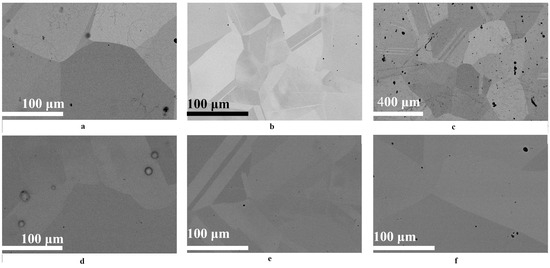 The results of studying the structure of the original CoCrFeNi and CoCrFeMnNi alloys and the Ni sample using the SEM method are shown in Figure 3. It can be seen that the samples have a coarse-grained structure, with a grain size of about 200 μm for Ni, 80 μm for CoCrFeNi and 100 μm for CoCrFeMnNi (Figure 3a–c). In all samples, the grains have a regular polygonal shape with traces of twinning introduced by cold-rolling.