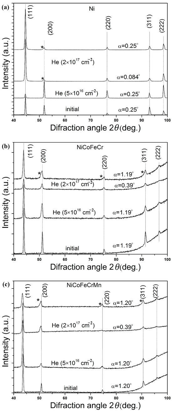 XRD patterns of unirradiated and irradiated (by He2+ ions (2 × 1017 cm−2)) (a) Ni, (b) NiCoFeCr and (c) NiCoFeCrMn HEA samples, obtained at different angles of incidence α of X-ray irradiation. The asterisk denotes the shoulder of asymmetric diffraction peaks.