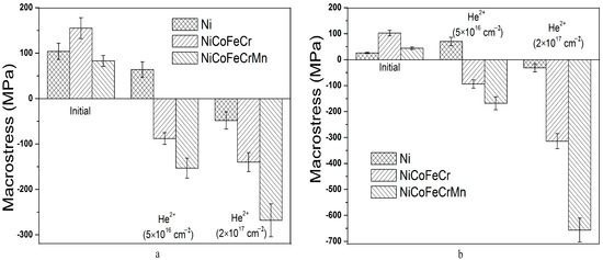 An important point is the comparison of the behavior of macrostresses in the HEAs of NiCoFeCr and NiCoFeCrMn. As seen in Figure 5, the stress level in NiCoFeCrMn alloys is higher and they grow faster with increasing fluence than in NiCoFeCr. This indicates a high density and low mobility of radiation defects (especially helium vacancy clusters) in the NiCoFeCrMn HEA. It is known that the HEAs of NiCoFeCrMn after irradiation are characterized by a lower radiation swelling and damage, the absence of radiation-induced segregation, a higher density of dislocation loops and distortion of the solid solution lattice compared to the HEAs of NiCoFeCr [40,52,53,54,55,56].