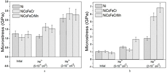 Microstresses in unirradiated and irradiated (by He2+ (40 keV) ions) Ni, and NiCoFeCr and NiCoFeCrMn HEA samples at Region 1 (a) and Region 2 (b).