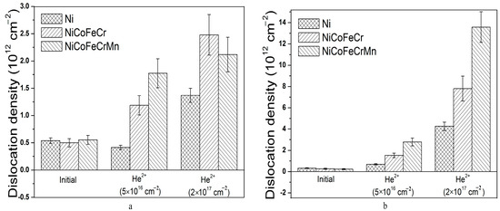 Dislocation density in unirradiated and irradiated (by He2+ (40 keV) ions) Ni, and NiCoFeCr and NiCoFeCrMn HEA samples at Region 1 (a) and Region 2 (b).