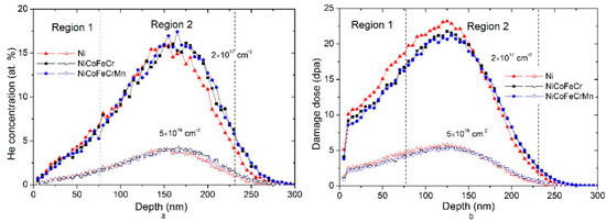 Distribution of (a) implanted helium and (b) damaging dose in Ni, NiCoFeCr and NiCoFeCrMn HEAs irradiated by He2+ (40 keV) ions.