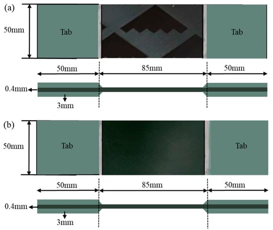 The two types of samples were made of T300 unidirectional carbon fiber/epoxy resin prepreg, which were manually cut, laid, and prepared by the autoclave (RG21, Xi’an Longde Technology LLC, Xi’an, China) forming process. Each group of samples consisted of two layers of prepreg. The thickness of a single prepreg layer was 0.2 mm, and the thickness of the sample was 0.4 ± 0.01 mm.