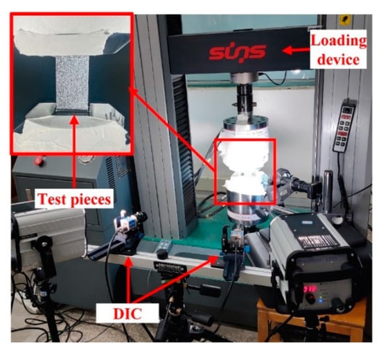 Two sets of samples were loaded under tension by an electronic universal testing machine, as shown in Figure 3. The test was controlled by displacement at a speed of 0.5 mm/min, and the real-time load–displacement curve was recorded during the test. Additionally, a 3D-DIC device was used to monitor the distributions of displacement and strain on the surfaces of the samples during loading.