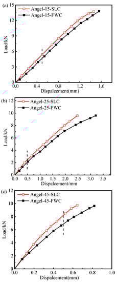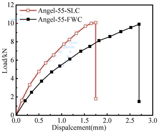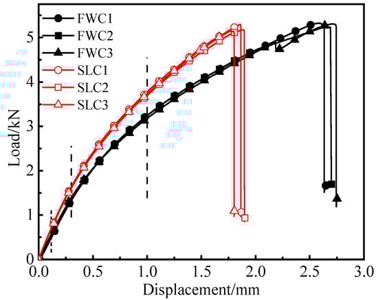The displacement–load curves of the samples in each group showed good repeatability, with little dispersion within the groups. The load of the samples in each group presented nonlinear behavior along with the increase in the displacement, which was similar to the results reported in the literature [26,27,28].