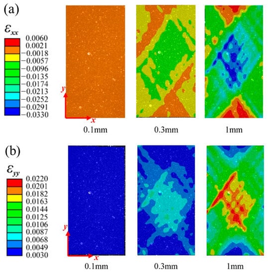 Figure 5 and Figure 6, respectively, show the variation in the horizontal strain () and vertical strain () nephograms of the laminated structure and FWC structure, which were monitored and analyzed by DIC under three different displacement loads (0.1 mm, 0.3 mm, and 1 mm, corresponding to the dotted line marks in Figure 4).
