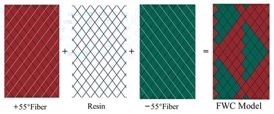 In previous studies, the majority of scholars have ignored the fiber cross-fluctuation, opting to instead adopt netting theory and classical laminate theory [8,9,10] to treat filament wound plates’ structure as laminated or antisymmetric laminated structures. Based on damage mechanics, the failure criteria of composite materials and stiffness degradation models (including a direct stiffness reduction [11] and progressive failure model [12,13]) were used to simulate the failure of FWC plates [14,15,16,17]. However, the appearance of a cross-fluctuation region makes the stress distribution and failure mode very complex. It is difficult to capture the influence of a fiber bundle winding pattern on the overall mechanical behavior of the structure by using the traditional laminated structure model to analyze the FWC structure, which includes limitations such as an understanding of the influence of the fiber winding pattern on the mechanical characteristics of the structure.