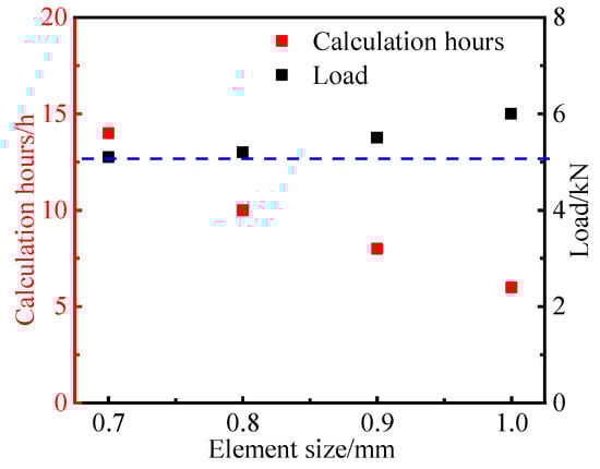 The effects of the element size on the simulation results were studied in order to ensure that an appropriate element size was used. All models were calculated using 10 central processing units. The element selected in the finite element model was the C3D8R solid element. As seen in Figure 9, as the element size reduced to 0.8 mm, the tensile force began to stabilize. However, the computational time increased dramatically as the element size decreased. Therefore, the mesh size at the edge of the hole was set at 0.8 mm in this study to strike a balance between the computational efficiency and computational accuracy.