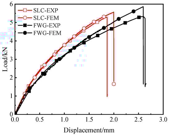 The stiffness of the load–displacement curve predicted by the numerical model of the laminated plates was basically the same as that of the experiment, and was obviously higher than that of the FWC plates.