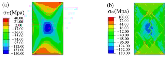 Transverse stress nephograms, predicted by FEA ((a) laminated plate, (b) FWC plate).