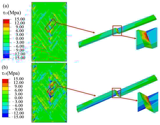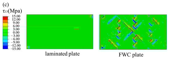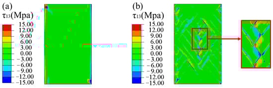 Figure 14 shows the stress () nephograms of the laminated and FWC plates under a tension displacement of 1 mm. Except for a few areas of stress concentration at the gripper end of the laminated plate, the shear stress in most areas was relatively uniform, while the FWC plate had an obvious stress concentration phenomenon in the fiber cross-fluctuation region.