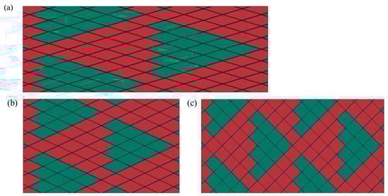 In FWC structures, fiber bundles cross and undulate with each other, which is different from conventional laminated structures [5,6,7]. During a single winding cycle, the wound fiber bundle intersects with the previous wound fiber bundle, resulting in an undulating architecture. The FWC structures usually have the appearance of diamond-shaped characteristic patterns, which are arranged periodically. The distribution of fiber bundles within each diamond-shaped pattern can be divided into two kinds of regions: (1) the laminated region, where fiber bundles in the +φ and −φ directions are laid parallel without undulation; and (2) the cross-fluctuation region, where fiber bundles in the +φ and −φ directions intersect at the boundary area.