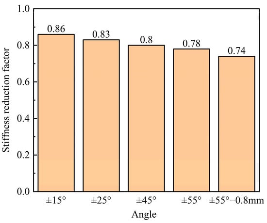 Further numerical studies showed that the stiffness reduction coefficient of filament wound plates with winding angles of ±55° decreased from 0.78 to 0.74 as the bundle thickness increased from 0.4 mm to 0.8 mm. The stiffness reduction coefficients of filament wound plates with wound angles of ±15°, ±25°, and ±45° were 0.86, 0.83, and 0.8, respectively.