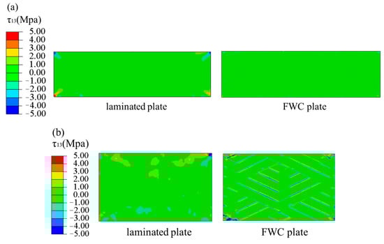 Shear stress nephograms, predicted by FEA ((a) laminated plate, (b) FWC plate).