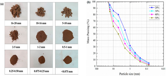 The formation lithology of the Chongqing region, China, consists mainly of silty clay, sandstone, mudstone and sandy mudstone. These materials are widely used to construct levees and earthen dams in China and are internally unstable in essence. In order to facilitate the local selection of the experimental materials, a mixture of mudstone and clay from this region was selected as the raw material for this study. The raw materials retrieved from the site were sieved and then secondly proportioned. The particles with a diameter of 0–20 mm were then selected as the experimental materials (see Figure 2a). The soil–rock threshold (S-RT) can be used to distinguish the particle size limits of “soil matrix” and “rock block” in S-RM; it is a very significant physical property index of S-RM. According to some previous studies [29,30], the method of determining the S-RT has been given. Medley proposed that the S-RT is not a fixed value but should be a variable value related to the area of the S-RM, denoted as 0.05, where is the scale of engineering features such as the tunnel diameter, slope height and laboratory sample diameter. Taking into account the geomechanical contribution of the blocks, Zhang et al. [30] and Tu et al. [31] gave the S-RT criterion as 5 mm. Meanwhile, in this paper, considering the size of the laboratory test samples, the S-RT criterion of 5 mm is adopted. This means that the S-RM could be defined as “soil” if the particle size less than 5 mm, whereas it could be defined as “rock” if the particle size greater than 5 mm. The main physical property indexes of S-RM retrieved from the site are summarized in Table 1. Based on X-ray diffraction, the specific mineral composition of the rock is obtained, as shown in Table 2. Generally, the mechanical properties of S-RM depend on the joint action of soil and rock only when the rock content is between 25% and 75%. Considering the rock content of the raw material, four rock contents of 20%, 30%, 40% and 50% are set, and the corresponding particle size distribution of each rock content is shown in Figure 2b. Figure 3 shows an SEM image of the soil particles’ surfaces. We found that the surfaces of the particles had an irregular scaly stacking structure with different sizes, and a small number of holes presented after local amplification.