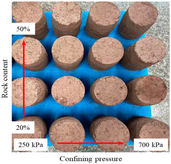 Triaxial compression tests were conducted under the conventional path, which consists of three basic steps. The first step is the preparation of the S-RM samples. Firstly, soil and rock are oven-dried at 103 °C for 24 h; the amounts of soil and rock required to achieve the target dry density are weighed according to the particle size distribution curve with different rock contents. Secondly, the required amount of water (gravimetric water content of 5%) is weighed and mixed evenly with the S-RM. Finally, the prepared S-RM is put into a cylindrical mold (which has a height of 200 mm and a diameter of 100 mm) in three layers and compacted in a stratified manner. In order to enhance the interlayer connectivity of the samples, artificial chiseling is applied to the interlayer contact surfaces. Double rubber membranes are utilized to prevent the membrane from being punctured by the sharp corners of irregular-shaped rock blocks.