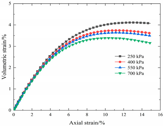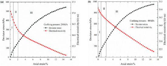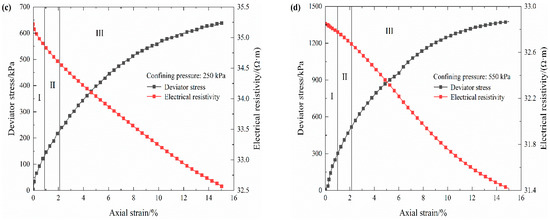 In general, in the process of complete strain, the electrical resistivity curve of the S-RM samples shows a gradually decreasing trend that presents an irregular “slightly concave shaped”. The volumetric strain curves of the loaded coal and rock mass have obvious inflection points; based on this, for convenience, their stress–strain curves are commonly divided into different deformation stages in existing experiments to study the electrical resistivity variation properties [10,11,12]. In this paper, there is no obvious inflection point in the volumetric strain curve of S-RM, as shown in Figure 6. Therefore, combining the electrical resistivity evolution characteristics of S-RM samples and the classification methods of different deformation stages of coal and rock mass, the deformation process of samples is roughly divided into three distinct deformation stages, and there are differences in the reduction rate of electrical resistivity under each stage. In the initial compaction stage (I), there is a short and rapid decrease in electrical resistivity; in the elastic deformation stage (II), the reduction rate of the electrical resistivity value diminishes with increasing axial strain; in the yield deformation stage (III), the reduction rate further decreases. The electrical resistivity of S-RM samples generally follows the following variation regularity: it initially decreases rapidly, then declines slowly and finally reduces gently. As reported in some triaxial shear test studies [28,32], the obtained stress–strain curves are also divided into several distinct deformation stages.