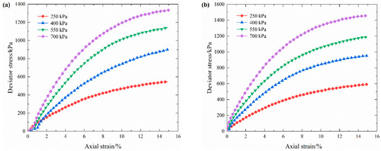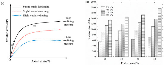 The stress–strain curves of each rock content under four confining pressures are plotted in Figure 7. By analyzing and summarizing the stress–strain curves, three different variation regularities can be derived, as shown in Figure 8a. Such variation characteristics are consistent with the results obtained by Zhang et al. [34]. This implies that the stress–strain characteristics of S-RM gradually change from a slight strain softening to a strong strain hardening as the confining pressure increases. The increasing rate of the deviator stress is fast at the beginning and then slows down soon after. Unlike rock mass, the stress–strain curve of S-RM has no obvious peak stress phenomenon. This indicates that S-RM has the strength property of being able to withstand a certain loading even in the late stage of strain. Therefore, it can be predicted that if the confining pressure is further increased, then the strain hardening characteristics of S-RM will be further enhanced. All of the S-RM samples show radial dilatation deformation that is more prominent in the middle of the samples, which can be attributed to the bottom layer of the samples withstanding the major compaction energy during the sample preparation and the pressure shaft acting directly on the top of the samples. Furthermore, in the late stage of strain, the energy dissipation caused by the partial coarse particle breakage is compensated for by adjusting the internal structure. Therefore, the apparent particle breakage does not result in a corresponding reduction in the deviator stress.