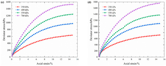 Stress–strain curves of S-RM for different confining pressures. (a) Rock content 20%. (b) Rock content 30%. (c) Rock content 40%. (d) Rock content 50%. The red circle symbols, the blue triangle symbols, the green inverted triangle symbols and the purple rhombus symbols represent confining pressures of 250 kPa, 400 kPa, 550 kPa and 700 kPa, respectively.
