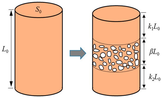For the convenience of analysis, it is assumed that the damaged sample consists of the middle section with structural damage and the two ends with structural integrity [27]. The structural damage mainly includes the changes in the failure morphology, deformation behavior and other characteristics, such as shear dilatation and strain hardening, which are closely related to the evolution of the meso-structure of S-RM. Assuming that the cross-sectional area and the height of the S-RM sample in the initial stage of damage propagation are S0 and L0, respectively, the heights of two ends with intact structure are and , where and are the proportion coefficients of the height of the two ends to the height of the entire sample, respectively. The height of the intermediate damage section is , where is the proportion coefficient of the middle section to the height of the entire sample. The damage mode of the S-RM sample is shown in Figure 9. , and satisfy the following formula: