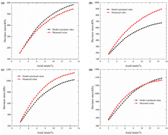 In order to verify the reliability of the established damage model, the stress–strain curves of S-RM samples with 20% rock content under four confining pressures obtained from the test are compared with the calculated results from the damage model proposed in this paper, and the results are shown in Figure 10.