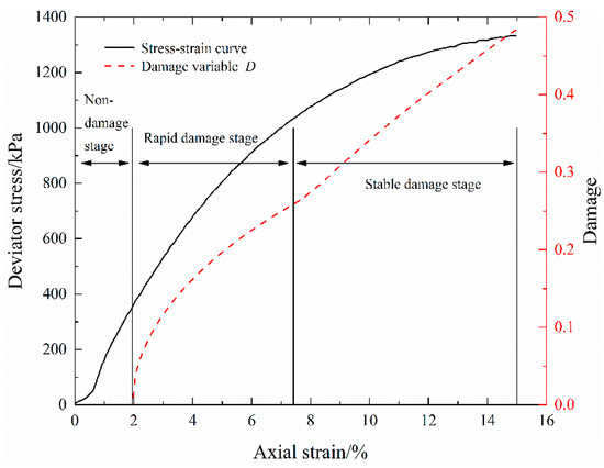 Electrical resistivity is an indicator of the generation of structural damage inside the geomaterials until the occurrence of macroscopic damage by monitoring the closure of pores and the generation and propagation of microcracks, which can effectively evaluate the damage degree of geomaterials. Moreover, this experiment seems to prove the conclusion in most of the literature that electrical resistivity can accurately characterize the mechanical behavior of soil. Through the variation curve of damage variable D, the damage evolution characteristics of S-RM are analyzed from the perspective of the changes in internal microstructure. Figure 11 plots the variation curve of damage variable D during triaxial shear (confining pressure 700 kPa) for S-RM samples with 20% rock content. The maximum value of D is about 0.483. The stress–strain curve and damage variable–strain curve in Figure 11 are obtained from the experimental data in this paper and Equation (11), respectively.