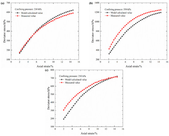 Measured results and calculated values of the damage model under partial confining pressures. (a) Rock content 30%. (b) Rock content 40%. (c) Rock content 50%.