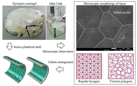 Nacre is a biomineralized material consisting of crystals and organic matrix, showing a well-organized “brick-mortar” structure [1,2], and it has received massive attention from researchers because of the high strength and toughness properties. About 95% of the nacre are made up of aragonite tablets (a brittle mineral), and the tablets are filled with a soft biopolymer organic matrix [3]. It is worth noting that nacre showed about 3–9 times more toughness than aragonite [3,4,5]. This outstanding performance is attributed to the tablet arrangement form, the tablet waves, and the multiple interfaces between tablets [6,7]. The arrangement of aragonite tablets can be divided into columnar and sheet [8]. Columnar distribution is a regular arrangement from layer to layer, and sheet distribution is a random distribution within the plane [9,10].