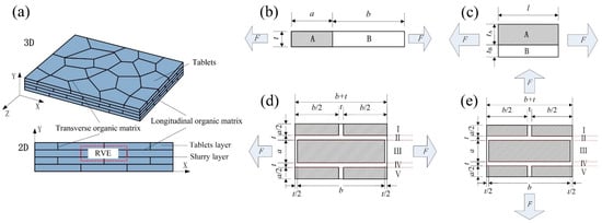 (a) Nacre-like composite structure model; (b–e) theoretical analysis model.